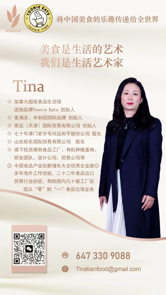 • 拥有 20+年食品行业经验,Tina 带领团队助力数十家中国工厂出海,将中国零食推向国际舞台。