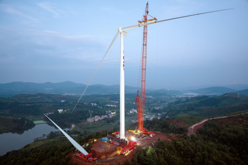 完成后的叶片被运往山地风电场,在塔架顶部以水平吊装方式固定。SANY 不仅制造叶片,还负责安装,并管理风电场数年后再出售项目。