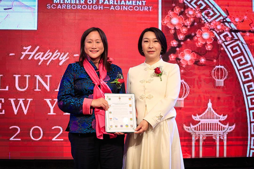 中国驻多伦多总领馆副总领事程洪波出席典礼并致辞。联邦国会议员叶嘉莉、省议员白必勤、列治文山市长David West、万锦市副市长陈国治,列治文山副市长陈志辉,万锦区议员李国贤,万锦区议员何胡景,多伦多议员高雪丽、麦智谋和万高利,万锦市议员杨,列治文山市议员崔冰辉,以及其他市级政要及侨界代表应邀出席;会上还宣读了加拿大联邦国会议员陈圣源、多伦多市长邹至蕙、中国国侨办,中国侨联,北京市侨联,云南省侨办,云南省侨联,山西省侨办,海南省侨办发来贺信。现场气氛庄重热烈,洋溢着团结奋进、共迎新程的节日氛围。
