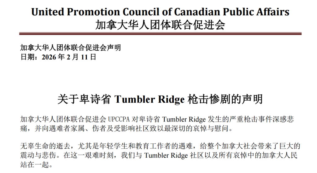 【加拿大讯】针对近日发生在卑诗省 Tumbler Ridge 的严重校园枪击事件,新成立的全国性组织——加拿大华人团体联合促进会(United Promotion Council of Canadian Public Affairs)正式发表声明,对遇难者及其家属表达深切哀悼,并向受影响社区致以诚挚慰问。