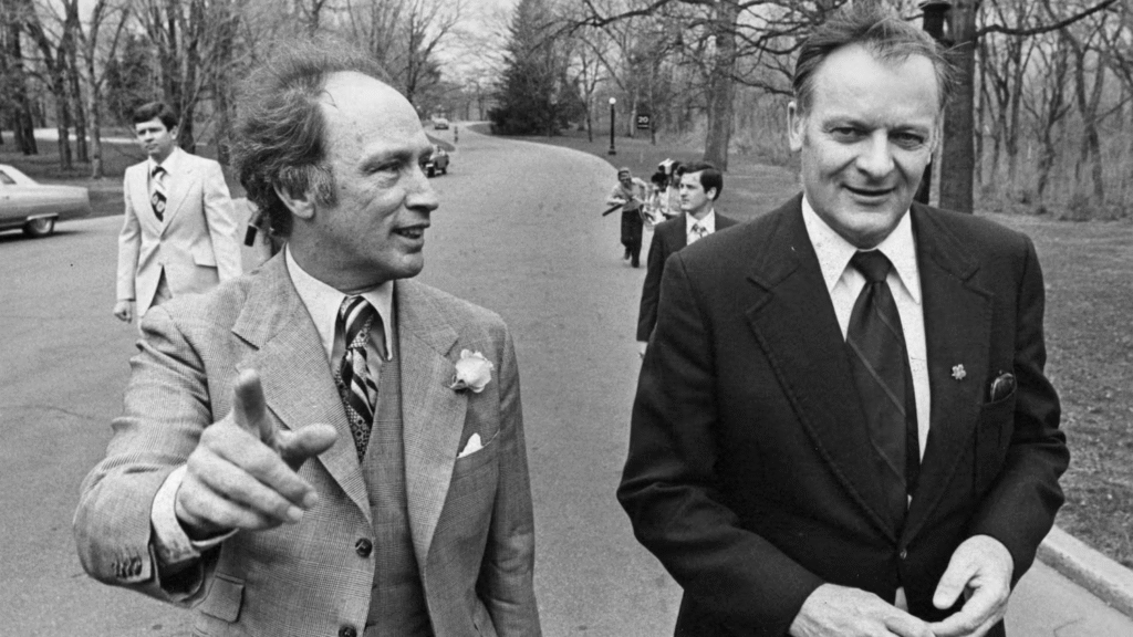 杰克·霍纳(右)于1977年离开进步保守党,加入自由党,并成为老特鲁多内阁的成员。他叛党的原因是党魁乔·克拉克拒绝保护他在阿尔伯塔省的克罗福特选区。该选区的选民对此并不满意——他们在下次选举中将霍纳投出了局。