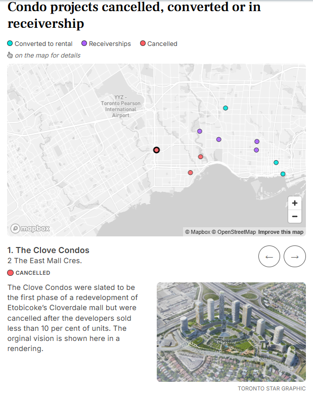 据《多伦多星报》统计,自2024年初以来,多伦多已有 十余个 项目进入破产接管、被取消或改为出租用途。