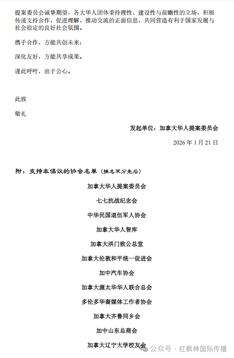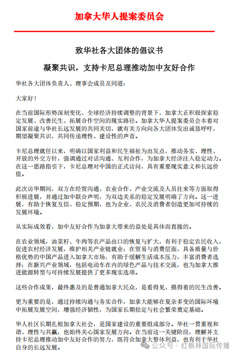 发起方为 Canada Chinese Proposal Committee(加拿大华人提案委员会)。该组织表示,倡议立足加拿大整体利益与社会长远发展,强调通过对话沟通与互利合作,为经济稳定、民生改善及社会和谐创造更有利的外部环境。