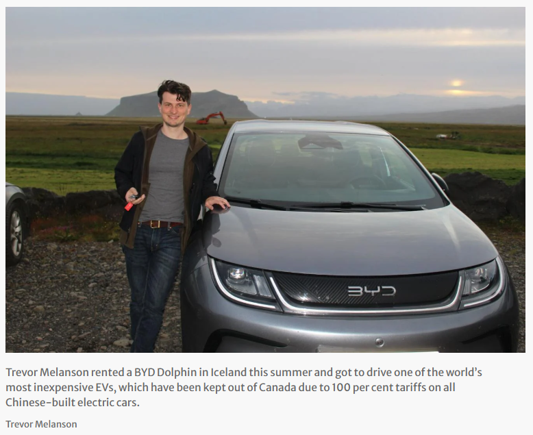 多伦多星报 Toronto Star 报道: 这个夏天,卑诗省居民特雷弗·梅兰森(Trevor Melanson)在冰岛租了一辆比亚迪海豚(BYD Dolphin)电动车,体验了全球最便宜的电动车之一。而这种车辆因加拿大对中国电动车征收100%的关税,在本国市场几乎绝迹。