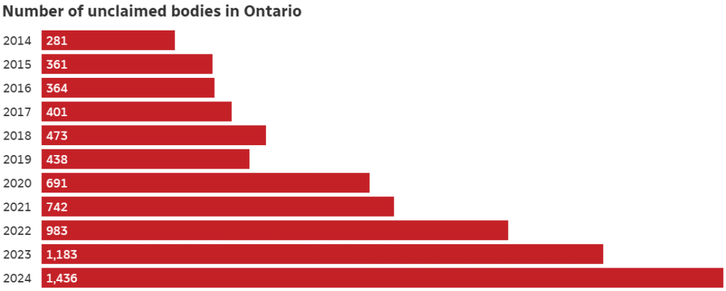 在安省,自疫情以来,无人认领的遗体数量急剧上升。