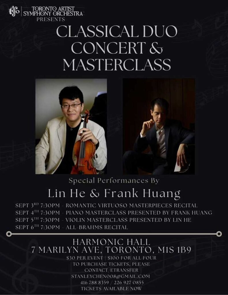 2025年9月初,多伦多艺术家交响乐团(TASO)将推出两场别开生面的室内乐专场音乐会,分别于9月3日及9月6日举行。受邀演出的是两位享誉北美的华裔音乐家——小提琴家何林(Lin He)与钢琴家Frank Huang。此外,他们还将举办大师课,分享舞台与讲台上的深厚修为。门票现已发售,乐迷不容错过。