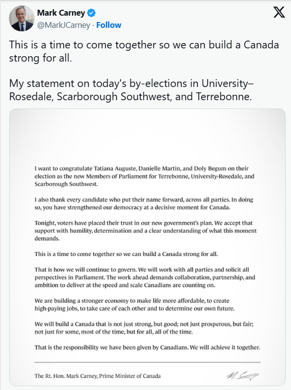 加拿大政坛迎来罕见一幕——总理马克·卡尼(Mark Carney)领导的自由党,在三场联邦补选中全部获胜,成功将原本的少数政府,转变为多数政府。