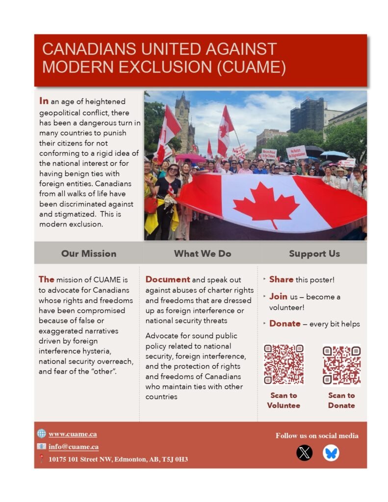 Canadians United Against Modern Exclusion (CUAME) was set up to advocate for Canadians whose rights and freedoms have been compromised because of false or exaggerated narratives driven by foreign interference hysteria, national security overreach, and fear of the “other”.