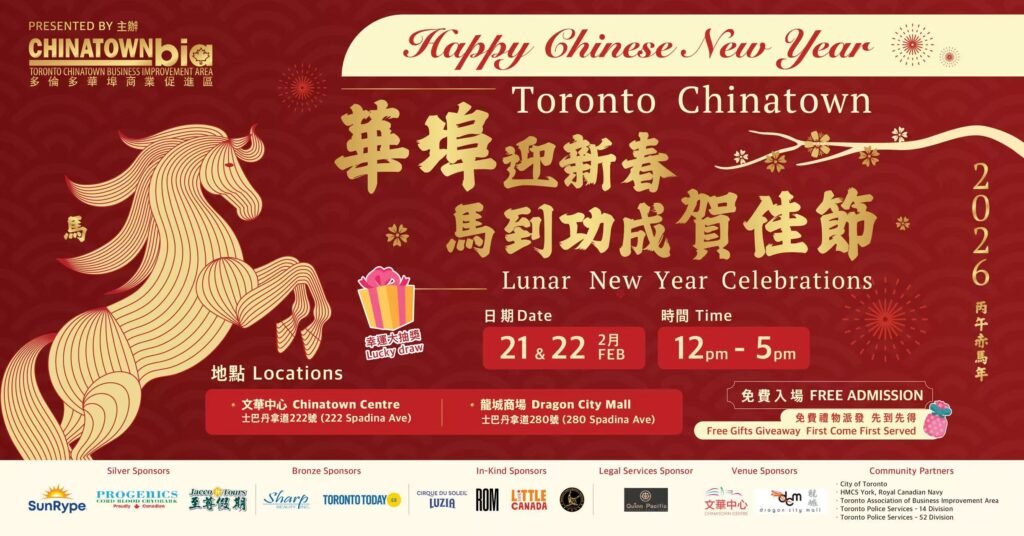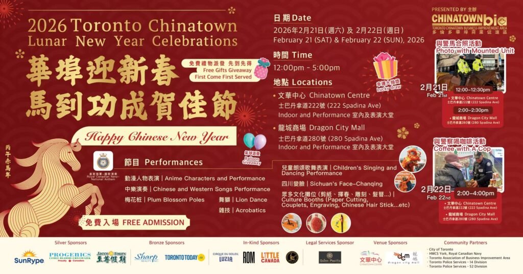随着农历新年的脚步临近,多伦多华埠将再度化身节庆海洋,一场充满传统文化、热闹气氛与新春祝福的年度盛典即将隆重登场。Chinatown BIA 诚邀各界朋友于 2026年2月21日(周六)至2月22日(周日) 齐聚华埠,共同迎接象征力量、活力与奋进精神的 马年。