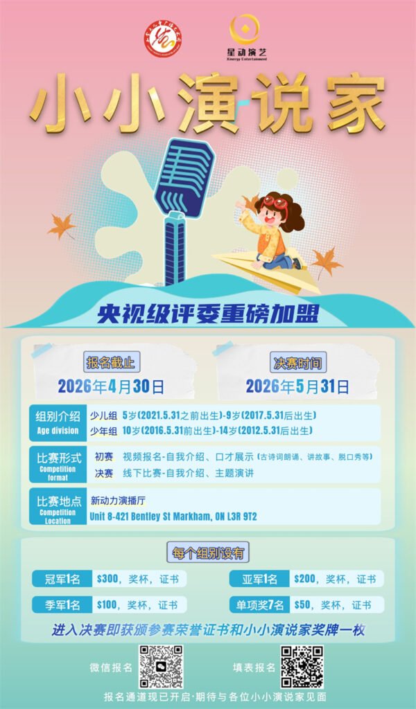 由思达保险独家冠名赞助,加拿大儿童广播艺术团与新动力传媒集团星动演艺联合主办的 2026 年安大略省《小小演说家》大赛现已正式开放报名。