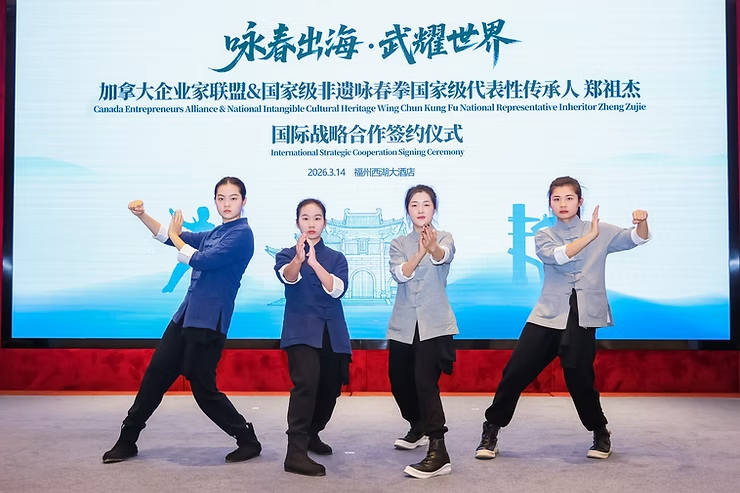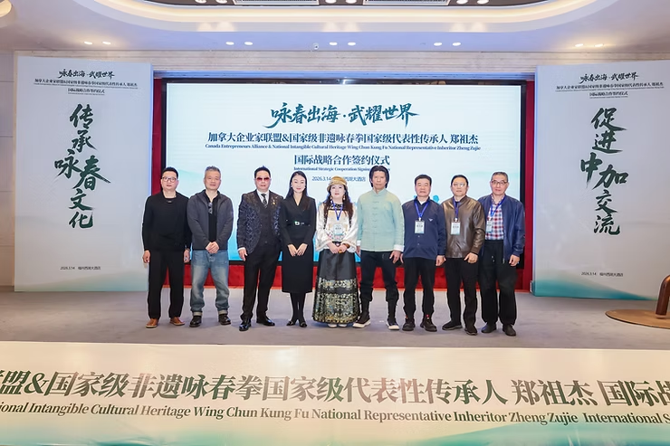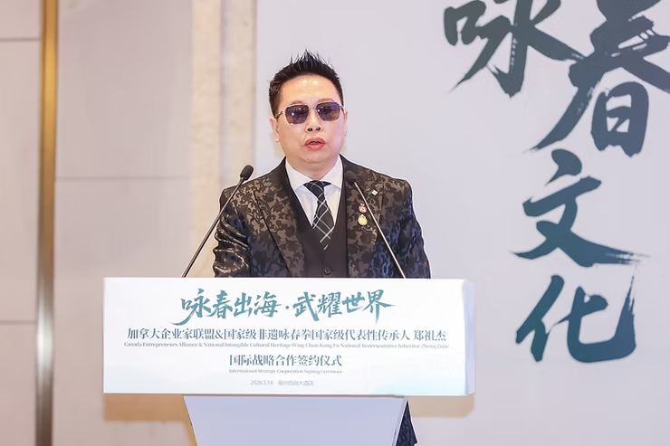 2026年3月14日,加拿大企业家联盟主动发起并主导推动,与国家级非物质文化遗产——詠春拳国家级代表性传承人郑祖杰先生,在福州市西湖大酒店正式签署战略合作协议。双方将围绕詠春文化的国际传播与体系化发展展开深度合作,并共同推进**“世界詠春拳总会加拿大总部”**的设立,打造中华武术全球化发展的关键枢纽。