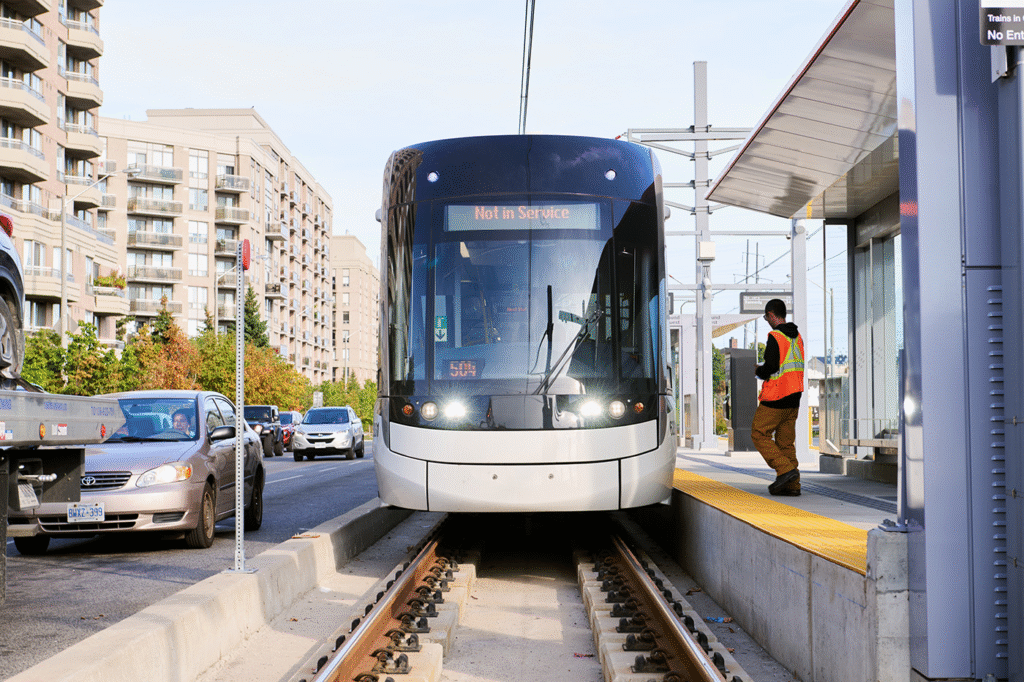 在多伦多 Eglinton Avenue 的路中央,测试列车已经跑了很久:车厢崭新、站台齐整、提示音照常响起——但车上没有乘客。沿线的公交乘客与车流继续被挤在有限车道里穿行,Eglinton Crosstown LRT(Line 5)则像一条“看得见却坐不上”的轨道,成了城市公共工程延误的代表性符号。